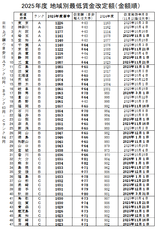 2025年度の地域別最低賃金の答申が出そろいました。(表)