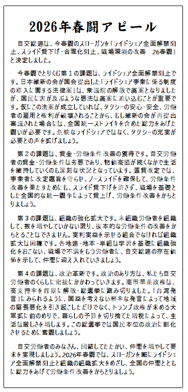 ライドシェア阻止、賃下げ阻止をたたかい抜くために、自交総連組織拡大オルグに奮闘することを決意いたします。