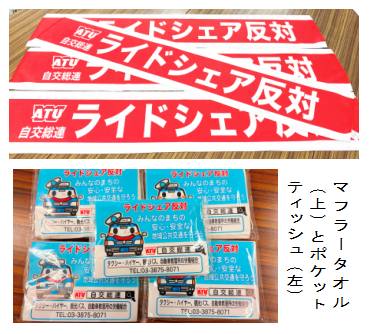 オリジナルの宣伝物(上写真)で通行人へアピール。利用者・乗務員を守る観点から断固としてライドシェアは許さないと広く訴え続けました。